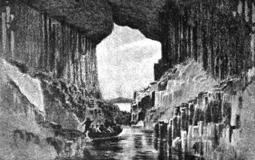Еще до начала входа из воды торчат мрачные базальтовые колонны, число которых трудно сосчитать. Пещера открывается прямо в океан величественным входом в виде арки в 15 саженей высоты и не менее 7 саженей ширины в основании. Стены пещеры представляют громадные шестигранные базальтовые колонны до 2-х аршин в диаметре, а потолок и самое дно — такие же колонны, но как бы спиленные искусственно. Надо полагать, что они были размыты непрерывными прибоями океанских волн. Глубина, т. е. длина пещеры около 60-ти саженей, причём пещера имеет слабый поворот, но из её конца всё же отлично виден выход в океан. Высота пещеры, по мере углубления внутрь постепенно уменьшается, но и в самом конце она не менее 10-ти саженей. Тут обломки базальтовых колонн представляют дикое нагромождение самого мрачного вида. Когда мы остановились в середине, рыбаки-лодочники предложили кричать, чтобы послушать эхо пещеры; эхо оказалось поразительной силы и продолжительности. Благодаря прозрачности воды, дно отлично видно, а отраженный от воды свет придает всей пещере фантастический зелено-голубоватый отблеск. Вдоль левой (стоя лицом к выходу) стены имеется узенькая тропинка, по которой можно ходить, держась за протянутый тут проволочный канат. Мы вышли на тропинку у самого конца пещеры и прошли по ней до выхода в океан. При этом на каждом шагу можно было любоваться разнообразием колоннады и дивными красотами освещения. Удары капель, падающих со свода в воду, производят поразительный и оригинальный шум. Говорят, что в бурную погоду этот шум походит на непрерывные раскаты грома в на пушечную пальбу. Здесь, как известно, Мендельсону в 1829 г. явились чудные мотивы его знаменитой увертюры «Die Hebriden».